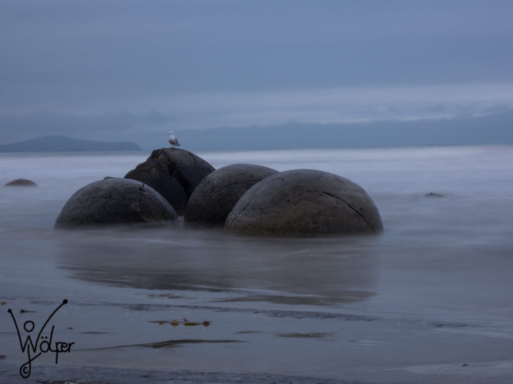 Die Moeraki Boulder haben dann als wunderschönes Fotomodel für die lange Autofahrt entschädigt. Viel früher als 19 Uhr braucht man in der Hochsaison aber nicht da sein, zumindest wenn man die einzelnen Steine mal für sich zum Fotografieren haben möchte. War immer noch recht viel los. Auch  die Gezeiten muss man beachten. Bei mir wurde gegen Ende doch ein großer Teil des Strandes überflutet.