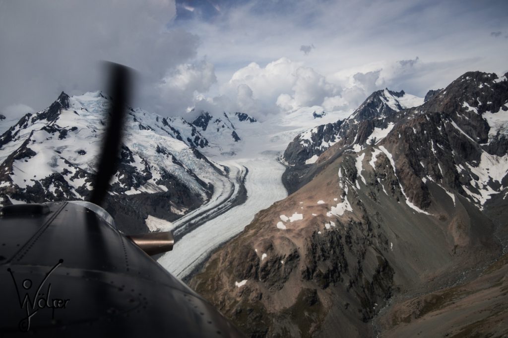 Am Dorf unter dem Mt. Cook angekommen, hab ich mich kurz orientiert und in der Tourist Info vorbei geschaut. Mit einem Blick auf Wetter und Uhrzeit bin ich dann erstmal direkt in Richtung Flugplatz gesprintet und hatte Glück noch einen Rundflug zu erwischen, den Letzten des Tages. Mit einer Pilatus ging es dann in Richtung Mt. Cook, inklusive Landung auf dem Gletscher. Sehr tolle Erfahrung und Ausblick!